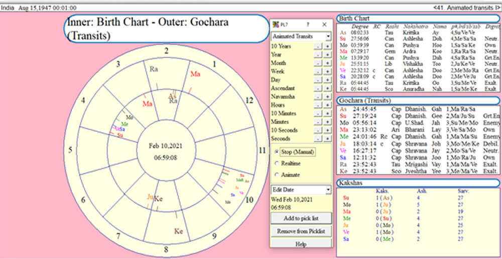 TRANSIT CHART OF INDIA OF 10th FEBRUARY 2021…. (Transit Chart in Outer Circle) OVER NATAL CHART (Inner Circle)